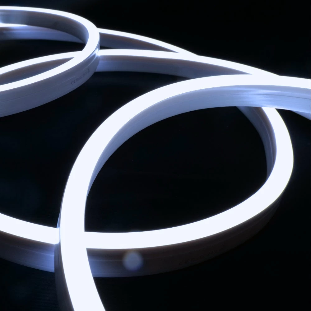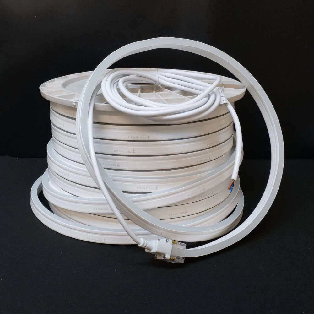 Our high-quality IP67 LED Neon Flex is horizontal bending which emits a bright warm white LED light from the top of the flex. Our led neon flex is a low voltage, compact, highly flexible, Pixel-free, Linear lighting solution. It can do a continuous run of 30 metres without any voltage drop and 60 metre if powered from both ends.