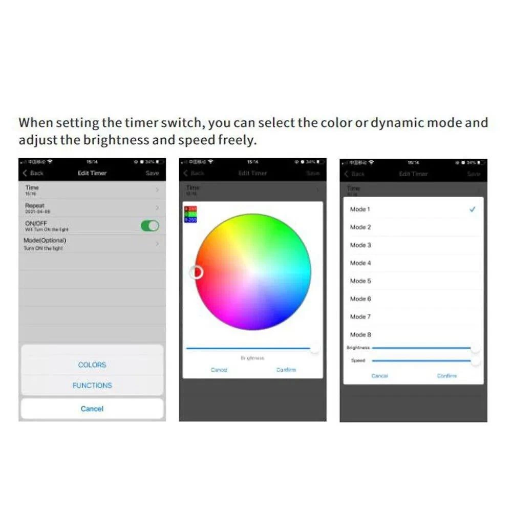- Multiple functions:built-in mic (The lights bounce to the rhythm of the music.), timer function(Time switch do not power off after setting),DIY lightning effect(Mix and match any lighting effect you want.),Over 100 effect modes,Group Control(APP can control multiple controllers),Select color from picture etc.