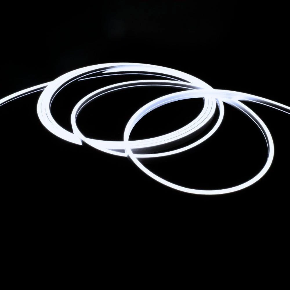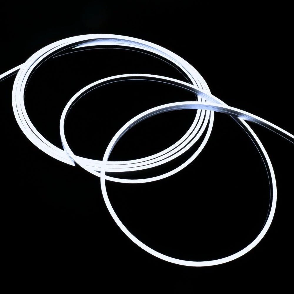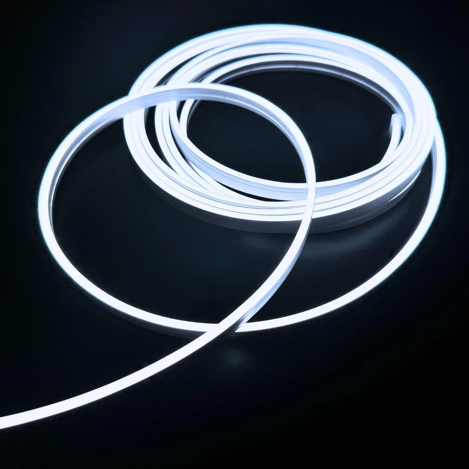 Our smallest most mini Cool White LED Neon Flex 6000K 4x10mm offers a non-spotting, fully diffused light output. The splashproof silicon coating is fully flexible with a bend radius of up to 30mm, making it ideal for use in signage and display installations both indoors and outdoors. It is cuttable every 3.5cm, super bright with 168LEDs per Metre
