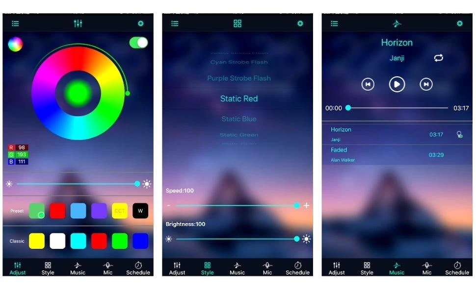 - You can set a timer to turn on/off the lights with your favourite colour, you can also control the light strips within responsive distance of 15m via the phone app. Comes with Microphone mode, which you can play music via the phone mic then lights will change colors and pulsate along.