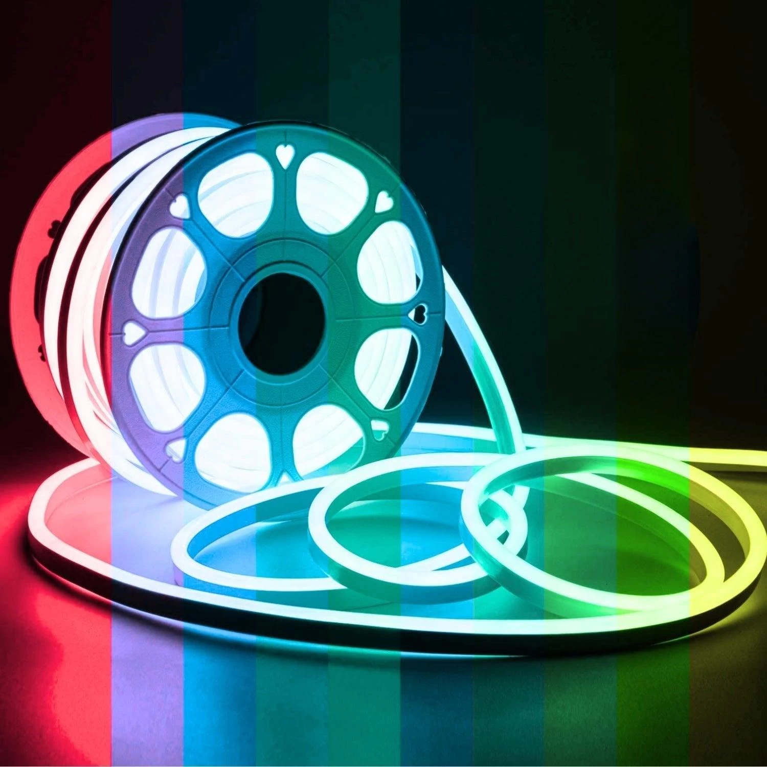 RGB Neon Flex Light 220 – 240V 14W/m has a translucent High-quality Silicone cover that offers dotless light and performs better than the standard Strip lights with visible individual LED Chips. Because it’s so flexible, its installation is simple and requires clips to installed anywhere and to adapt it to all sorts of shapes in horizontal bending (3cm bending raidus). The Waterproof feature of the Light makes it ideal for Indoor and Outdoor* (Splashproof) use.