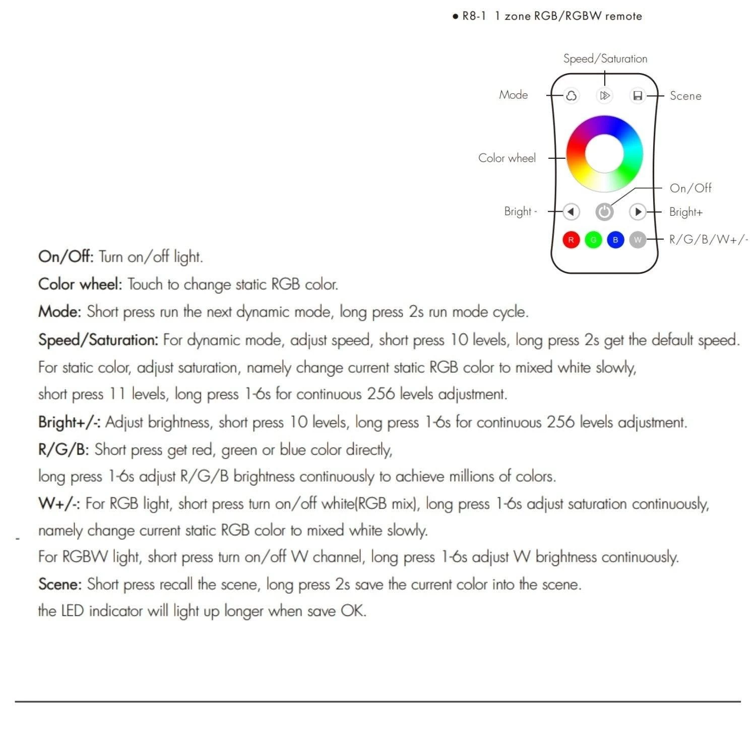 - 1 and 4 zone RGB or RGBW/Touch color wheel/Wireless remote 30m distance/CR2032 battery