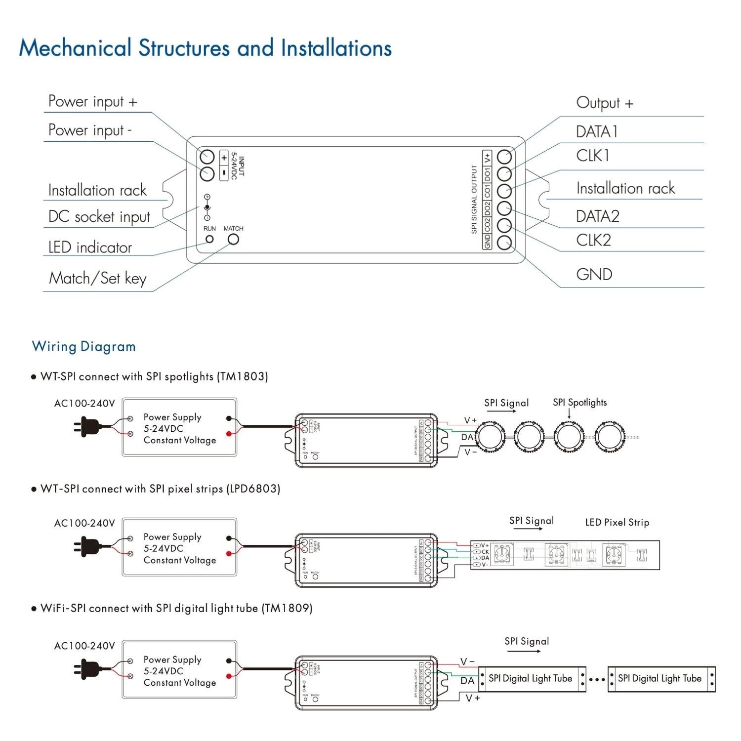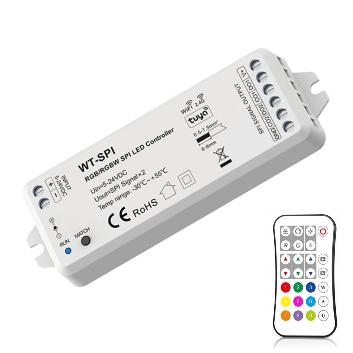 - ● Multi-pixel RGB/RGBW LED strip controller with SPI signal output, Tuya APP cloud control.