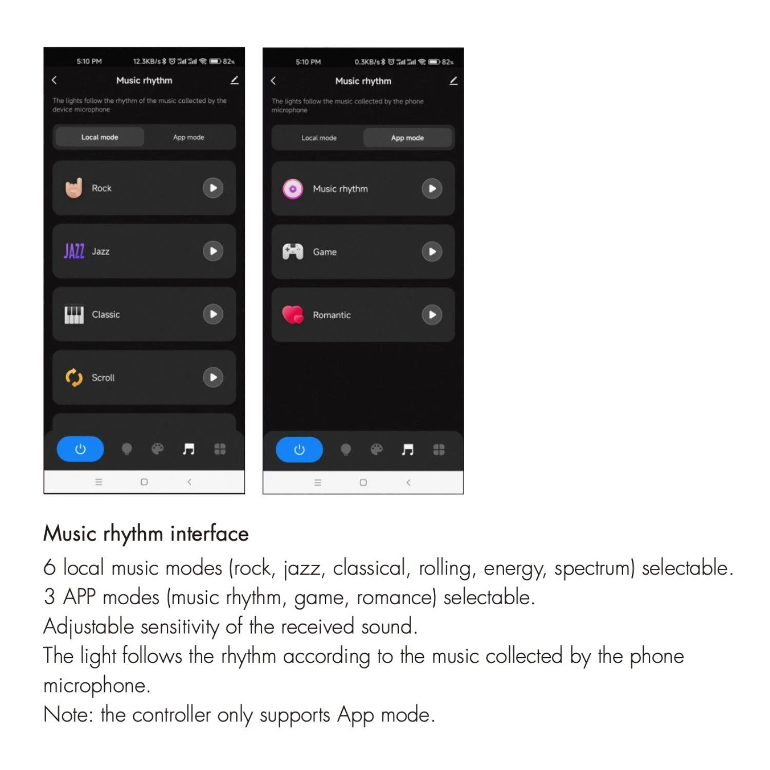 - ● Multiple music rhythms: 6 local music rhythms, 3 APP music rhythms.