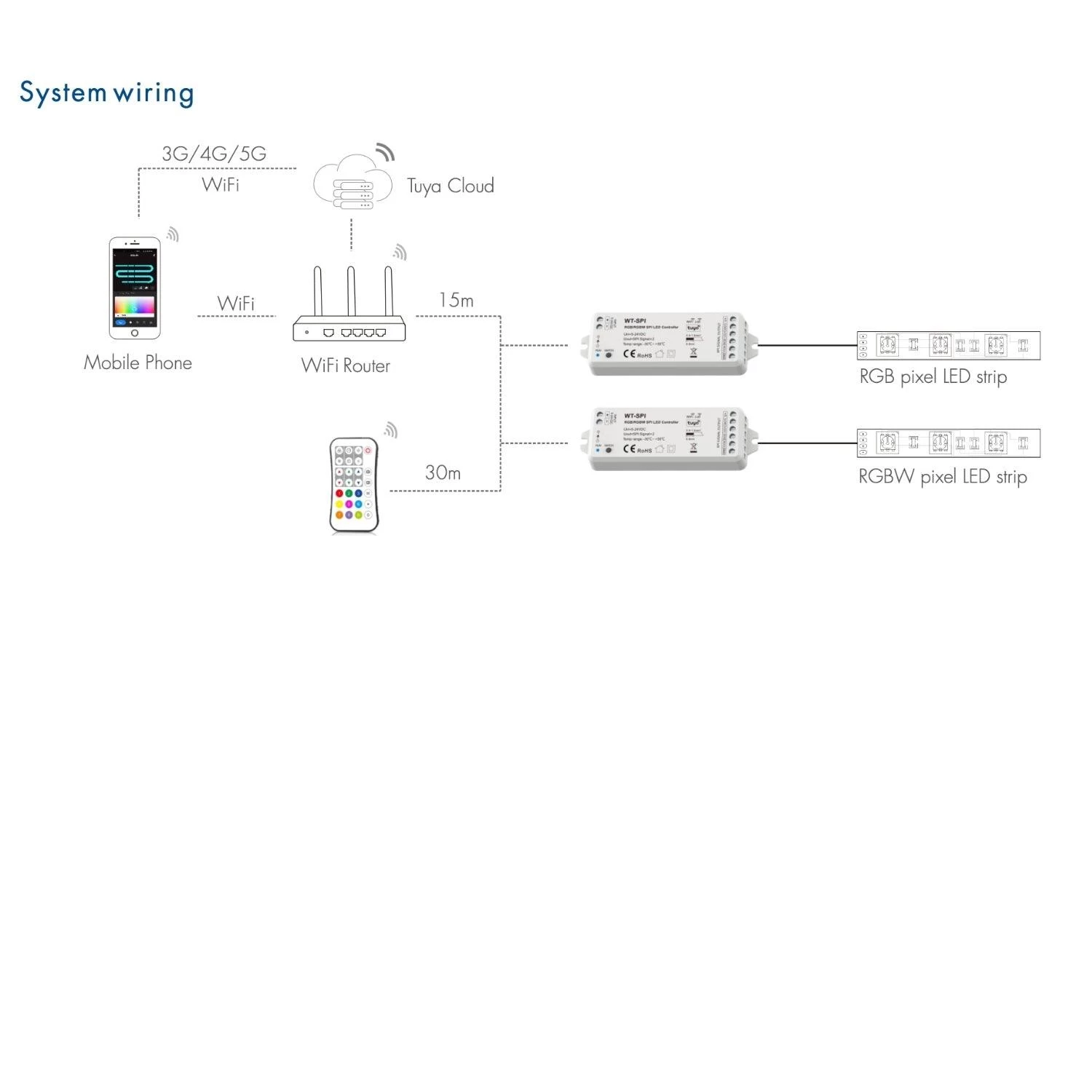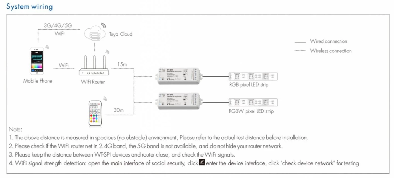 Tuya APP cloud control/Compatible with 45 kinds IC/Customized dynamic scenario mode/Multiple music rhythms/Wireless remote control